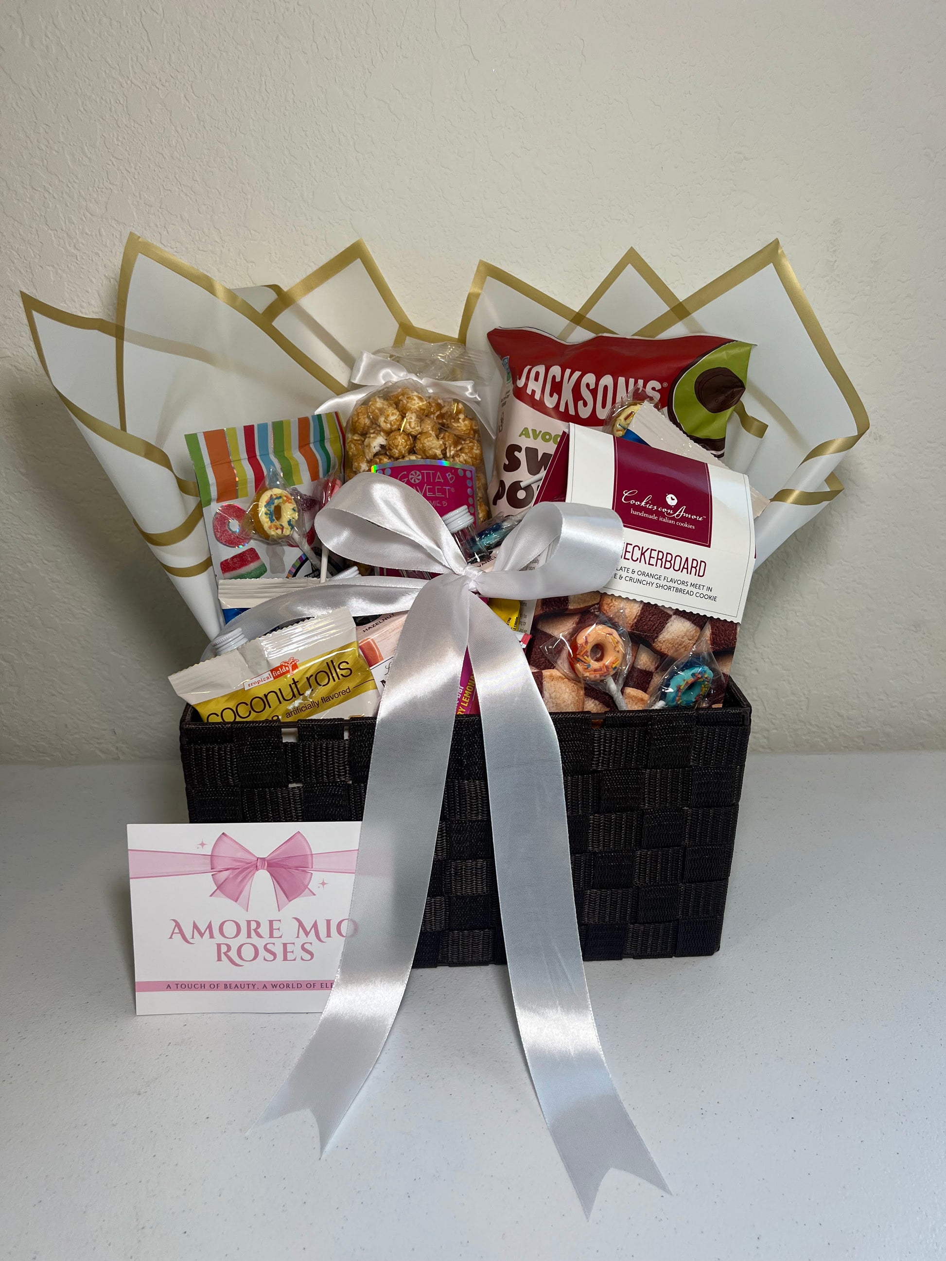 Thoughtfully curated and beautifully wrapped. Each basket is tailored to the occasion and recipient, filled with sweets, treats, self-care items, or your custom requests.