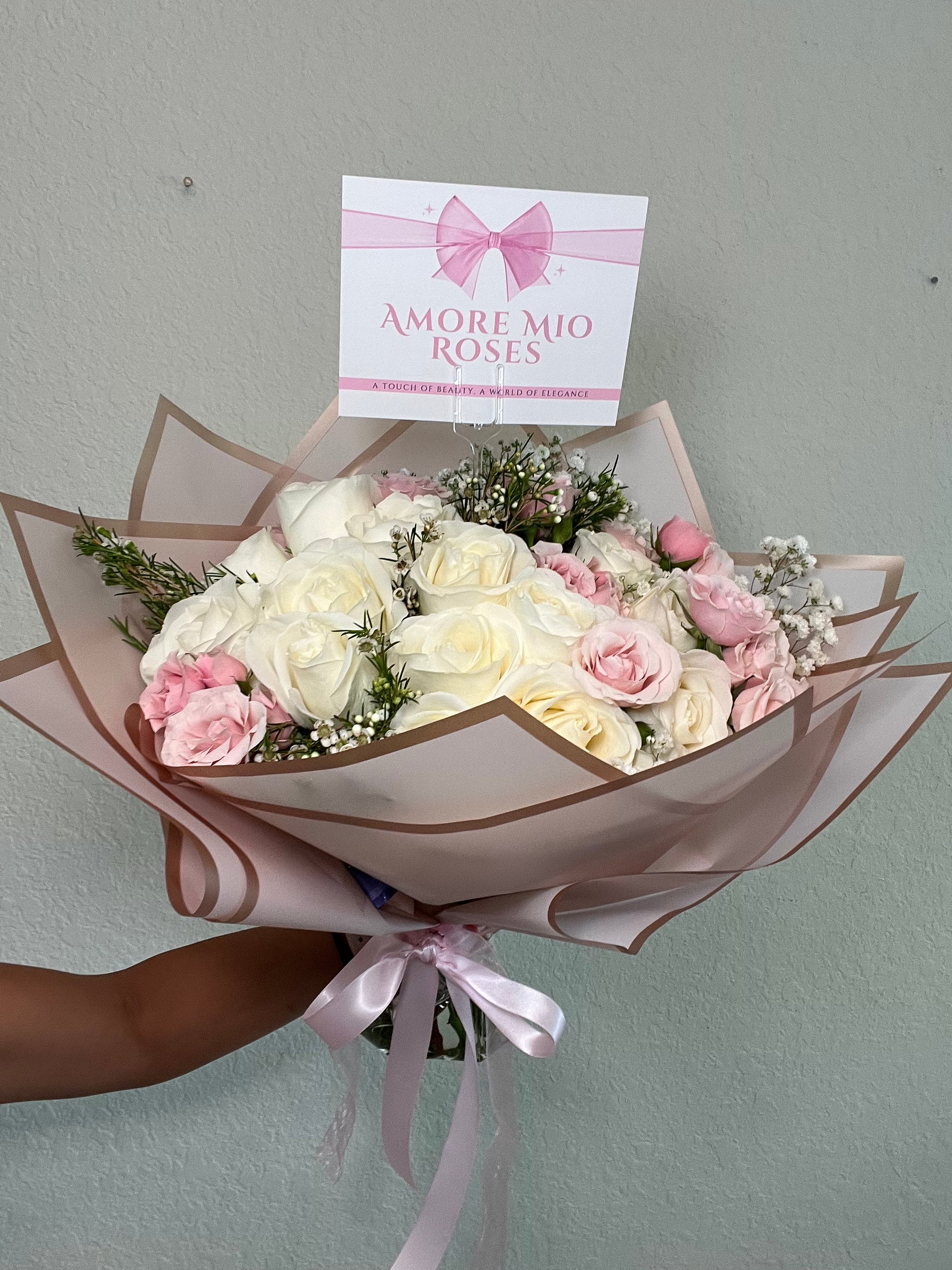 The Daydream Bouquet features a delicate blend of pristine white roses paired with soft-hued light pink spray roses. This arrangement’s gentle color palette creates an elegant and serene aesthetic, perfect for conveying subtle sophistication and heartfelt sentiments. Ideal for weddings, anniversaries, or as a graceful expression of sympathy and comfort. The bouquet’s harmonious tones bring a timeless charm to any setting.